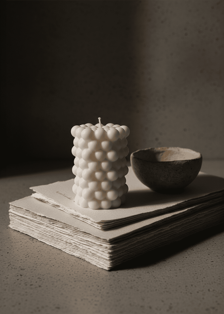 ⬥ NOTA: Por serem feitas à mão, as velas podem apresentar pequenas imperfeições ou ligeiras variações de cor e textura, refletindo a autenticidade do trabalho artesanal.