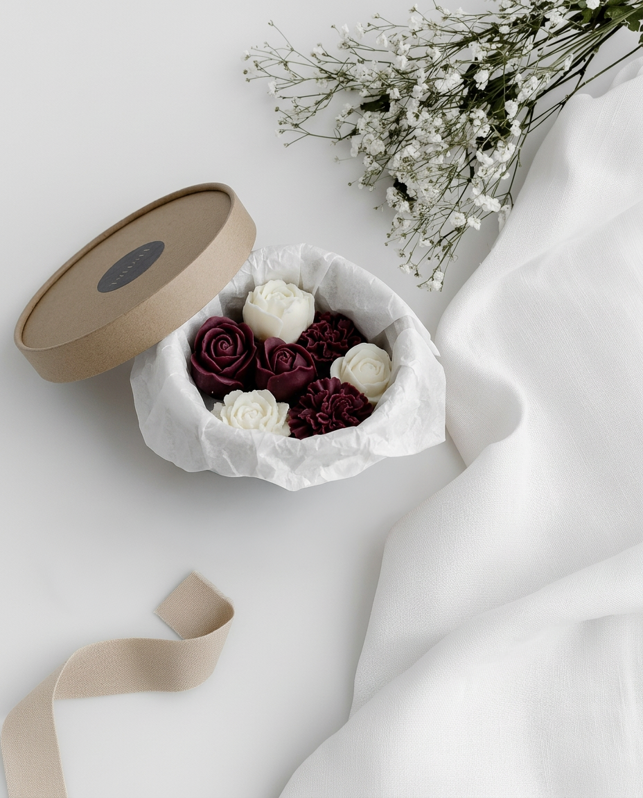 ✦ Wax melts florais artesanais ✦ 120g de cera vegetal ✦ Formas de peónia, ranúnculo, rosa e cravo ✦ Caixa kraft com laço de cetim marfim ✦ Pronta a oferecer ✦ Feita à mão em Portugal ✦ Ideal para Dia da Mãe, aniversários e momentos especiais