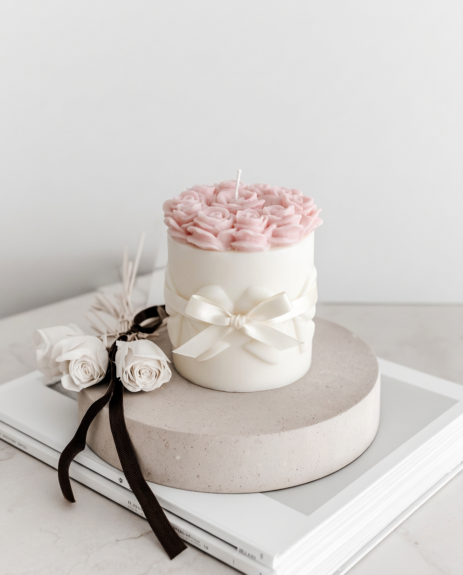 O corpo com laços em relevo abraça um topo completamente coberto de rosas, criando uma peça decorativa que conquista à primeira vista — e perfuma o espaço sem precisar de ser acendida. Basta tê-la perto para sentir a diferença.