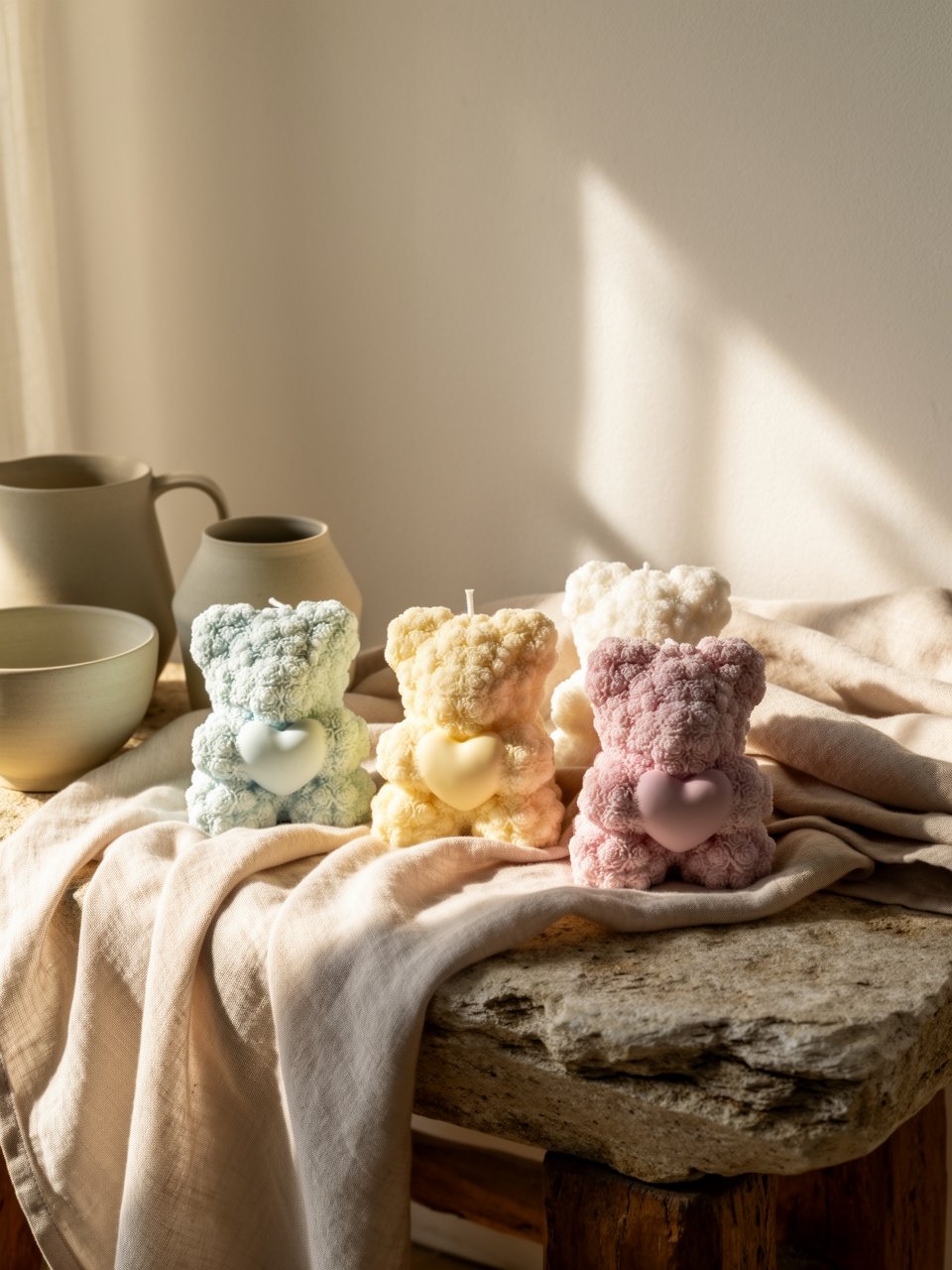 Velas Decorativas em forma de ursinho com textura de rosas.